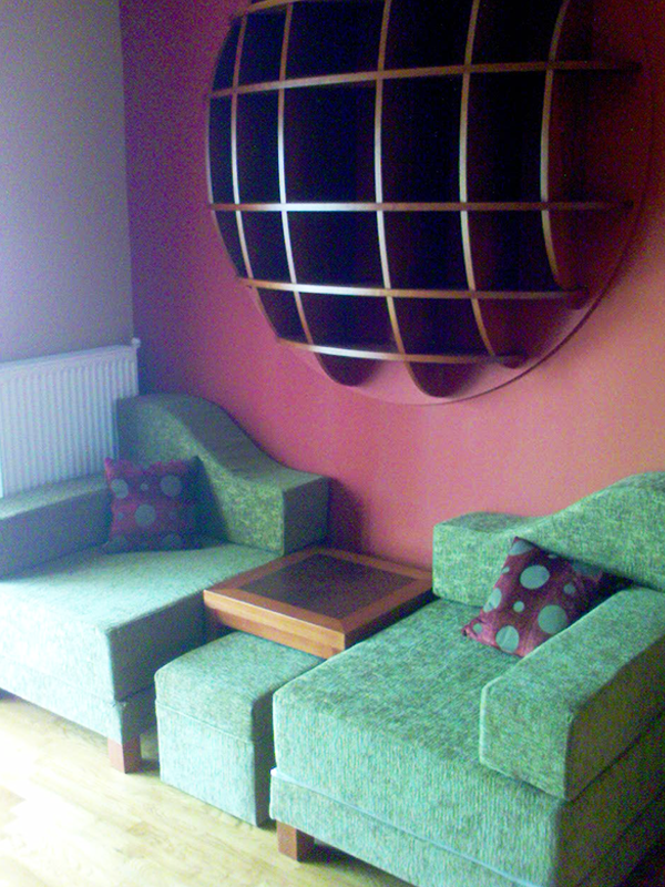 Βιβλιοθήκη, μορφής σφαίρας, ελλειπτικής κερασιάς, σετ πολυθρόνες στην ιδία στρογγυλάδα. Οι πολυθρόνες γίνονται κρεβάτια.