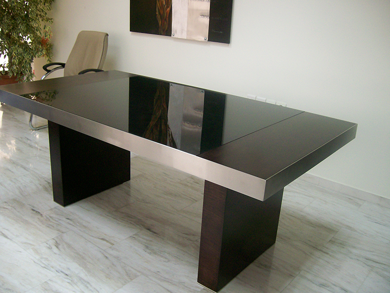 Γραφείο προφίλ 10 εκ. περιμετρικά μασίφ INOX. Εσωτερικά και στα πόδια τεχνικό δρυς απόχρωσης WEGE σε συνδυασμό με κρύσταλλο μαύρης λάκας.