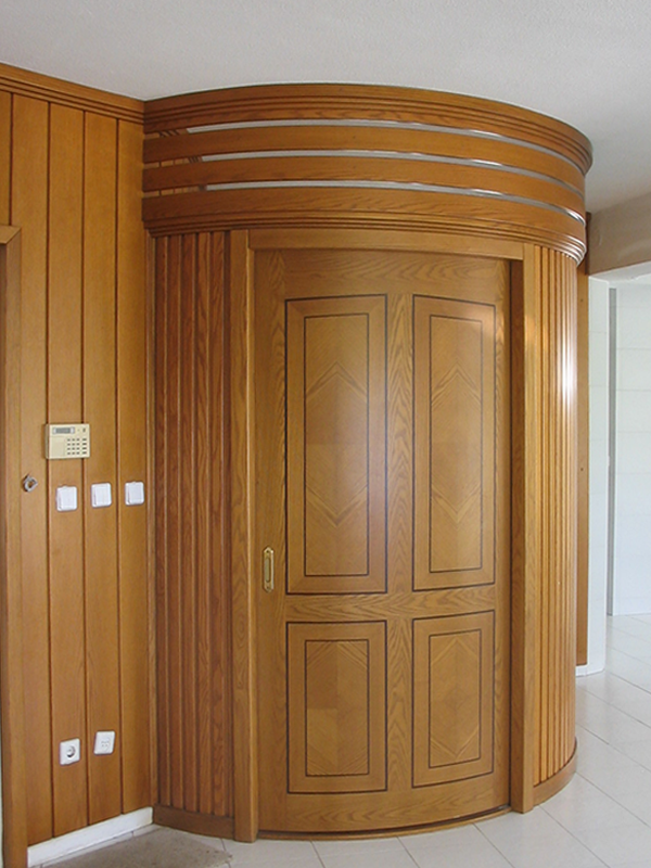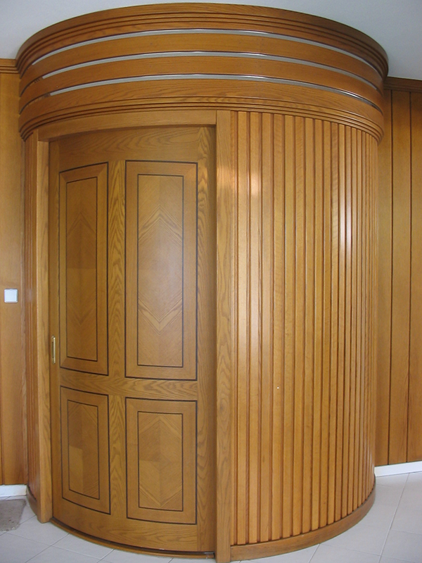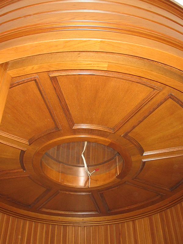 Στρογγυλός θόλος 8 εδρών οροφής με τμήματα INOX καθρέφτη, ξύλου μασίφ δρυός Αμερικής. Η επιφάνεια της συρόμενης πόρτας είναι κατασκευασμένη με τεχνική μαρκετερί με καπλαμά δρυός και έβενο.