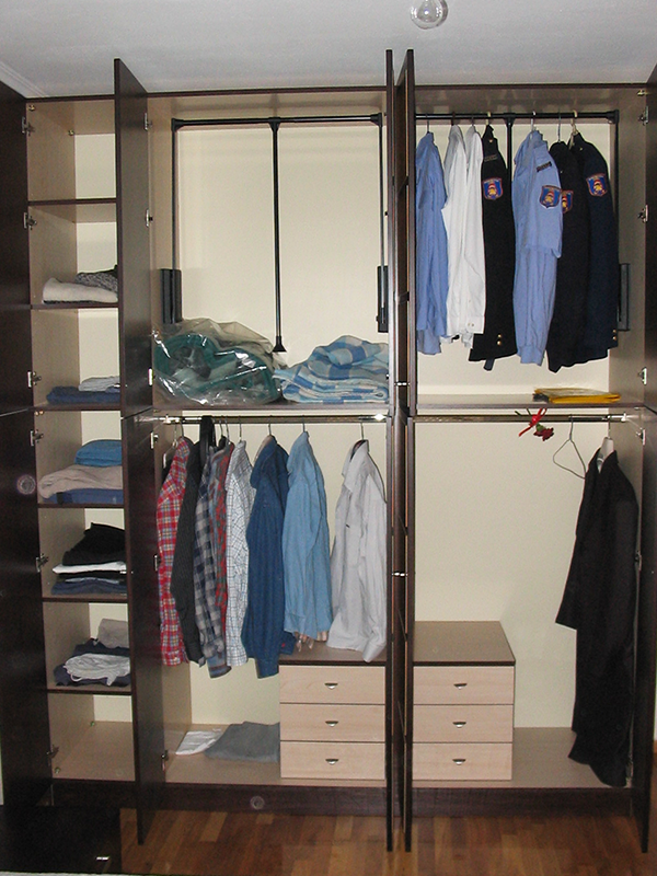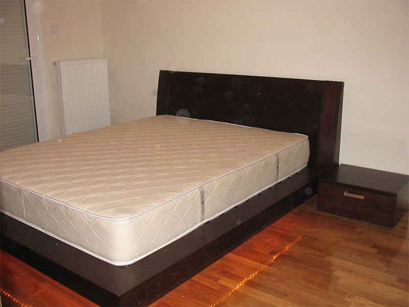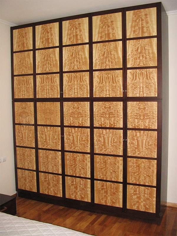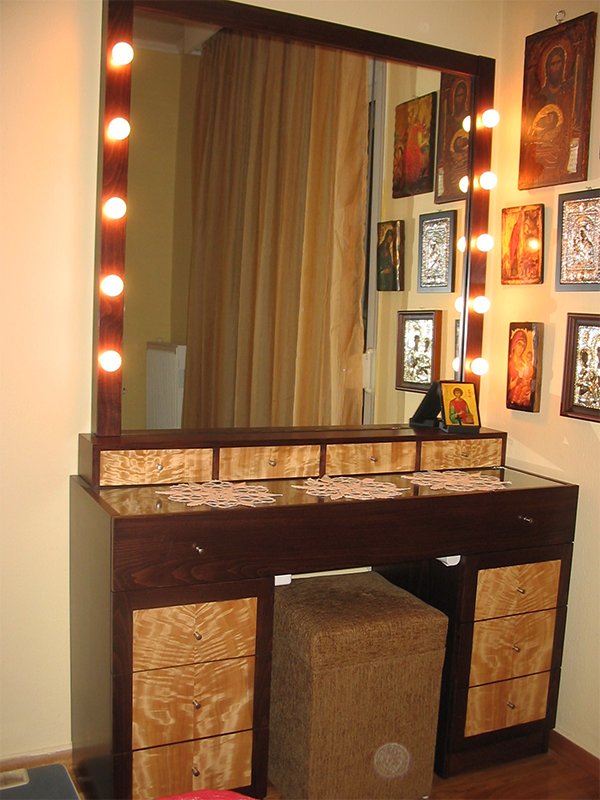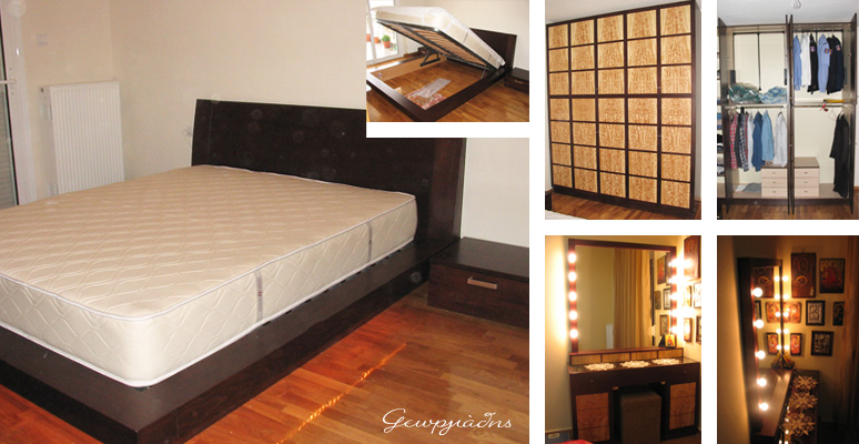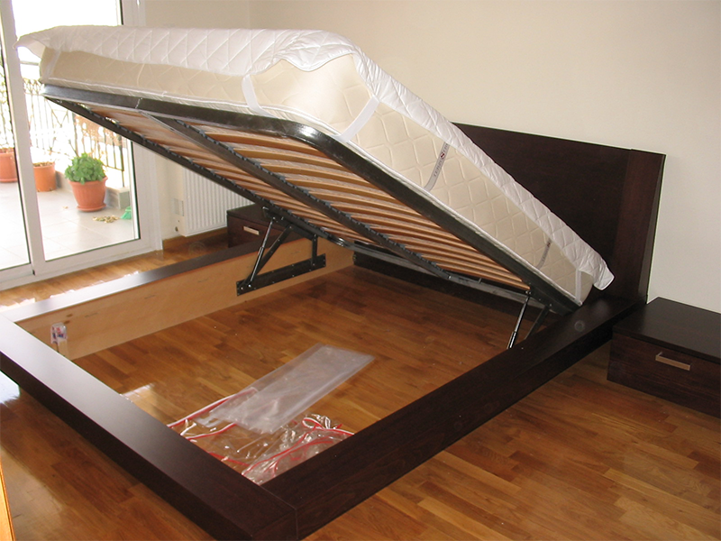 Κρεββάτι μασίφ οξιάς με μηχανισμό εσωτερικής αποθήκευσης, με κρυφούς φωτισμούς και καμπύλο κεφαλάρι, καλλιτεχνικό μπουντουάρ. Ντουλάπα με θέση αποθήκευσης χαλιών, ξυλεία οξιά σε απόχρωση WEGE σε συνδυασμό με μοναδική λεύκα σε φυσική απόχρωση.